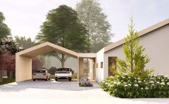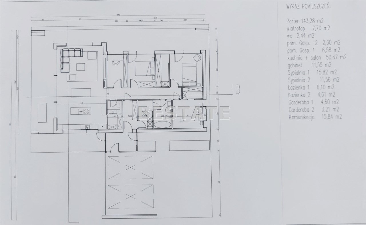Dom parterowy składa się z salonu połączonego z kuchnią o powierzchni 50,67 m.kw, dwóch łazienek o pow. 6,10 m.kw + 4,61 m. kw, wc o pow. 2,44 m.kw, dwóch sypialni o pow. 15,82 m.kw + 11,56 m.kw, gabinetu o pow. 11,55 m.kw, wiatrołapu o pow. 7,70 m.kw, dwóch garderób o pow. o pow. 4,60 m.kw + 3,21 m.kw, komunikacji o pow. 15,84 m.kw oraz dwóch pomieszczeń gospodarczych o pow. 6,58 m. kw+ 2,60 m. kw.