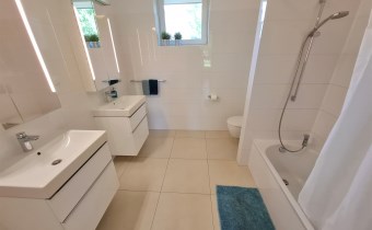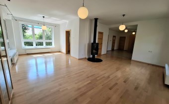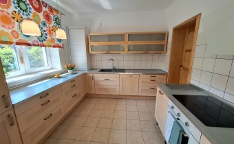 Salon z obrotowym kominkiem (28,20 m.kw) połączony z jadalnią (11,70 m.kw) tworzą piękną, otwartą przestrzeń. Kuchnia (10,20 m.kw) połączona jest z jadalnią co daje możliwość łatwej komunikacji między pomieszczeniami. Kuchnia wyposażona jest w solidne meble oraz sprzęty agd (płyta elektryczna, piekarnik, okap, zlewozmywak, zmywarkę, lodówkę). Na parterze znajdują się trzy sypialnie o powierzchniach 16,60 m.kw, 15,10 m.kw oraz 12,90 m.kw. W pobliżu sypialni jest duża łazienka wykończona glazurą i terakotą (7,80 m.kw), wyposażona w wannę, dwie umywalki oraz wc. Dodatkowo w strefie dziennej znajduje się osobne wc. Przez duży holl (35,80 m.kw) wychodzi się na taras oraz pięknie zagospodarowany ogród. W domu znajduje się także pomieszczenie gospodarcze (7,30 m.kw), w którym jest pralnia, kotłownia (6 m.kw) oraz przedsionek (3,40 m.kw).