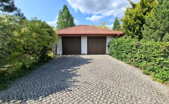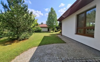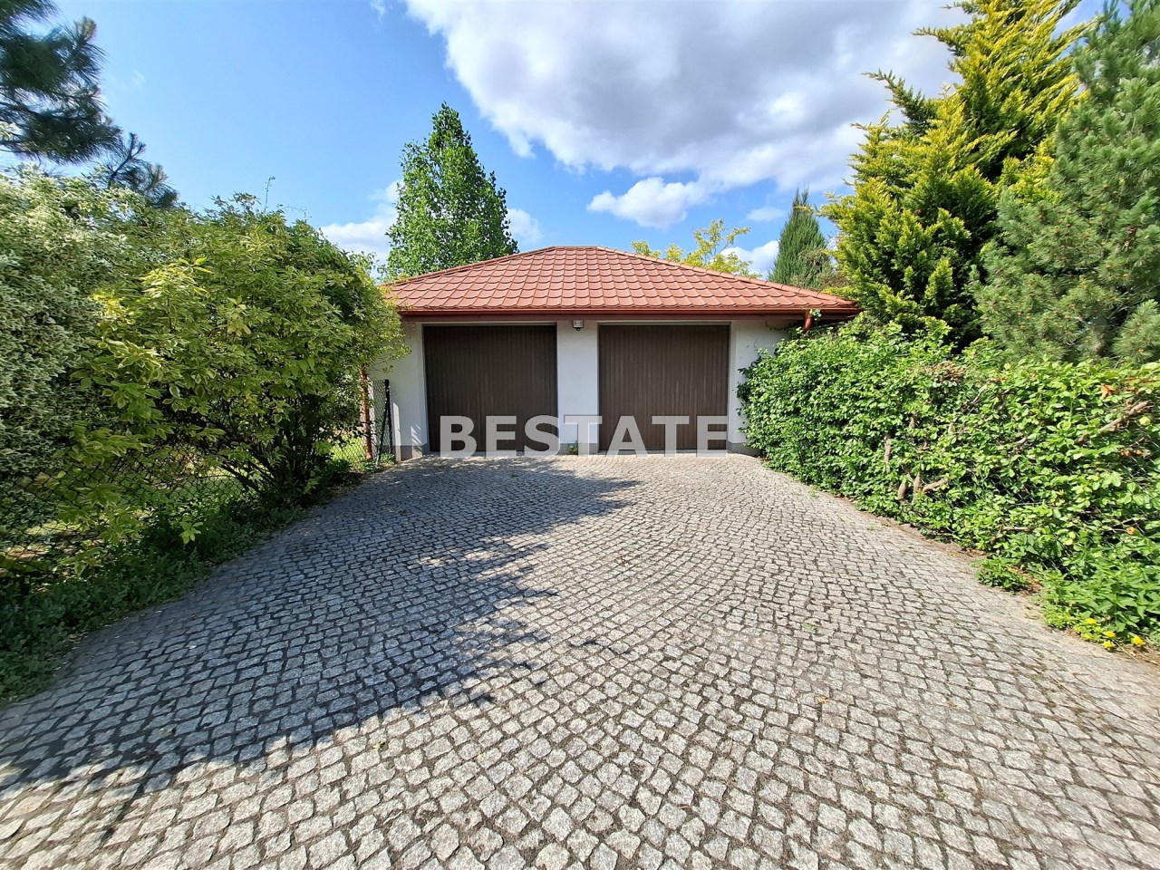 Wokół domu wykonano opaskę, taras i wejście główne z kostki granitowej. Na posesji znajduje się dwustanowiskowy garaż (41,50 m.kw) z dwiema niezależnymi bramami. Przed garażem wykonano duży podjazd z kostki granitowej, dzięki czemu zyskujemy kolejne dwa miejsca parkingowe. Nieruchomość o powierzchni 1200 m.kw ogrodzona jest siatką, obsadzona z każdej strony bujną roślinnością, dzięki czemu jesteśmy osłonięci od sąsiadów. W ogrodzie znajduje się dużo roślinności zimozielonej oraz rzadkie gatunki roślin, m.in. sosny rumelijskie, miłorząb, klon jesionolistny, cyprysik, perukowiec, tulipanowiec, jodła koreańska, milin amerykański, grujecznik japoński i wiele innych. Ogród wyposażony jest w instalację nawadniającą.