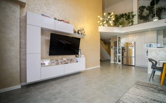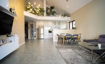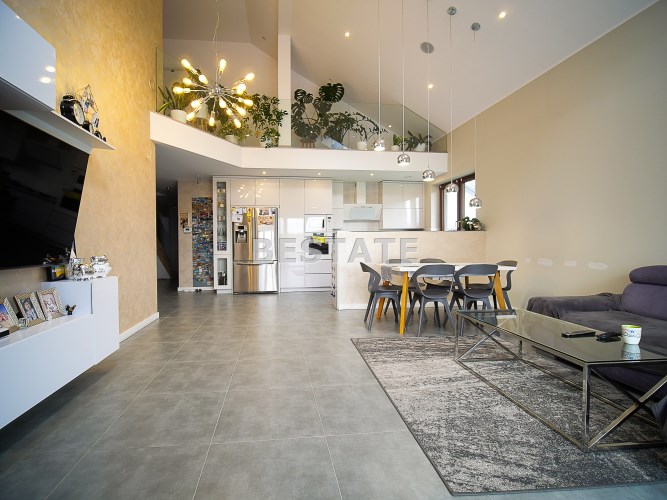 - przestronny salon z wysokim sufitem i dostępem do dużego tarasu,