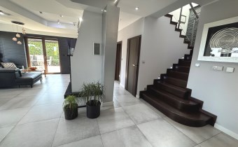 Na piętrze znajdują się trzy sypialnie ( jedna z garderobą 18,80 m.kw + 13,40 m.kw), 15,30 m.kw i 12,90m.kw, łazienki z wc o pow. 5,40 m.kw. Dom ogrodzony z automatyczną bramą wjazdową. Na działce znajduje się wiata dwustanowiskowa, altanka z urządzonym grillem, drewutnia i piękne nasadzenia. Automatyczne podlewanie ogrodu, oświetlenie zewnętrzne.