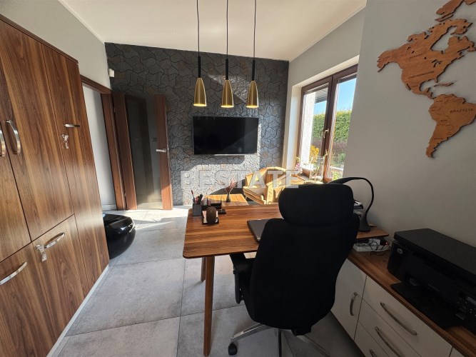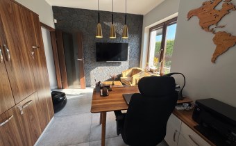 Nieruchomość składa się z salonu połączonego z otwartą kuchnią o powierzchni 52 m.kw, biura 10,40 m.kw, łazienki z wc o pow. 3m.kw, kotłowni o pow 4,90 m.kw, garażu 32,80 m.kw, garderoby, holu i wiatrołapu.
