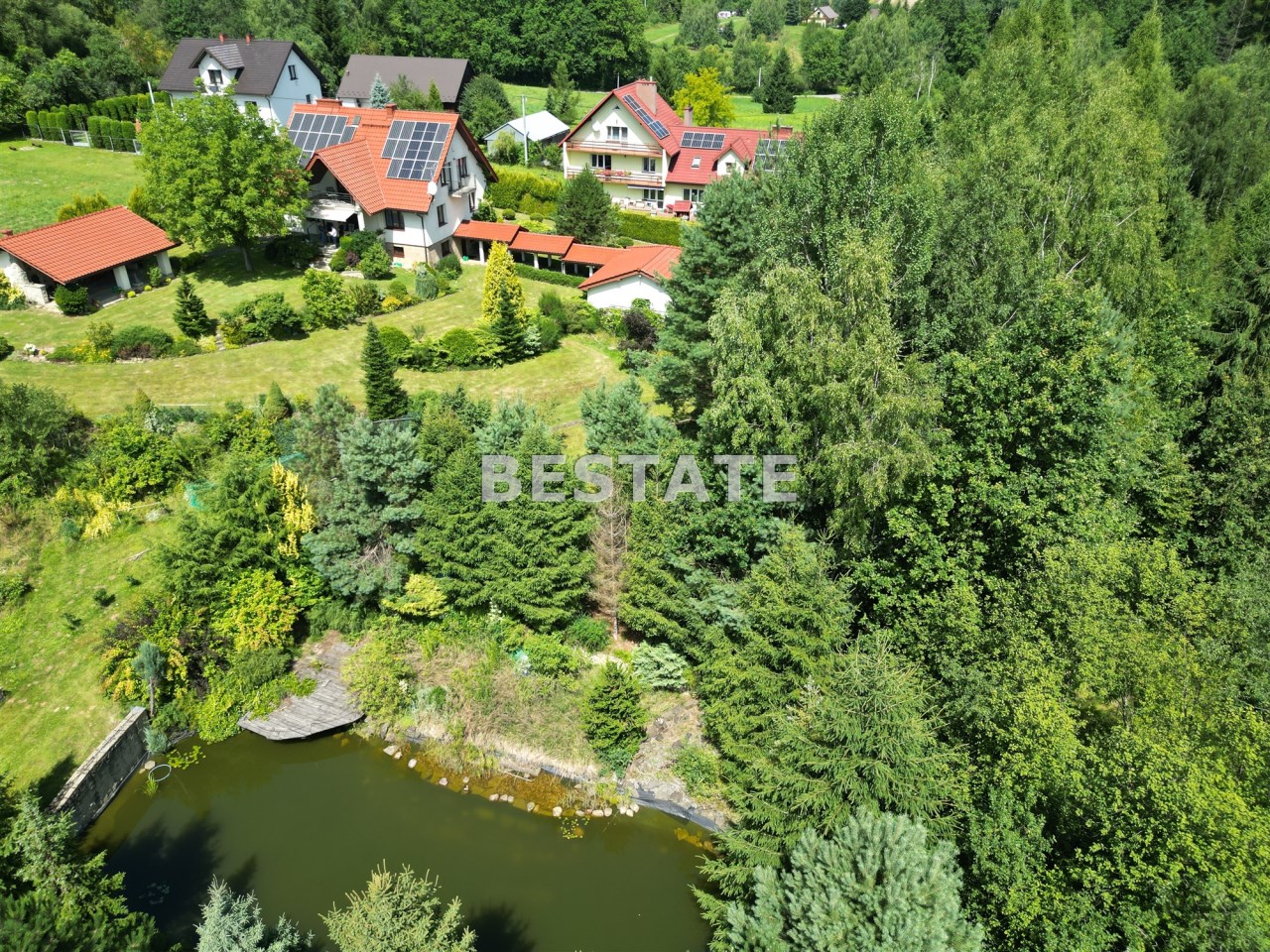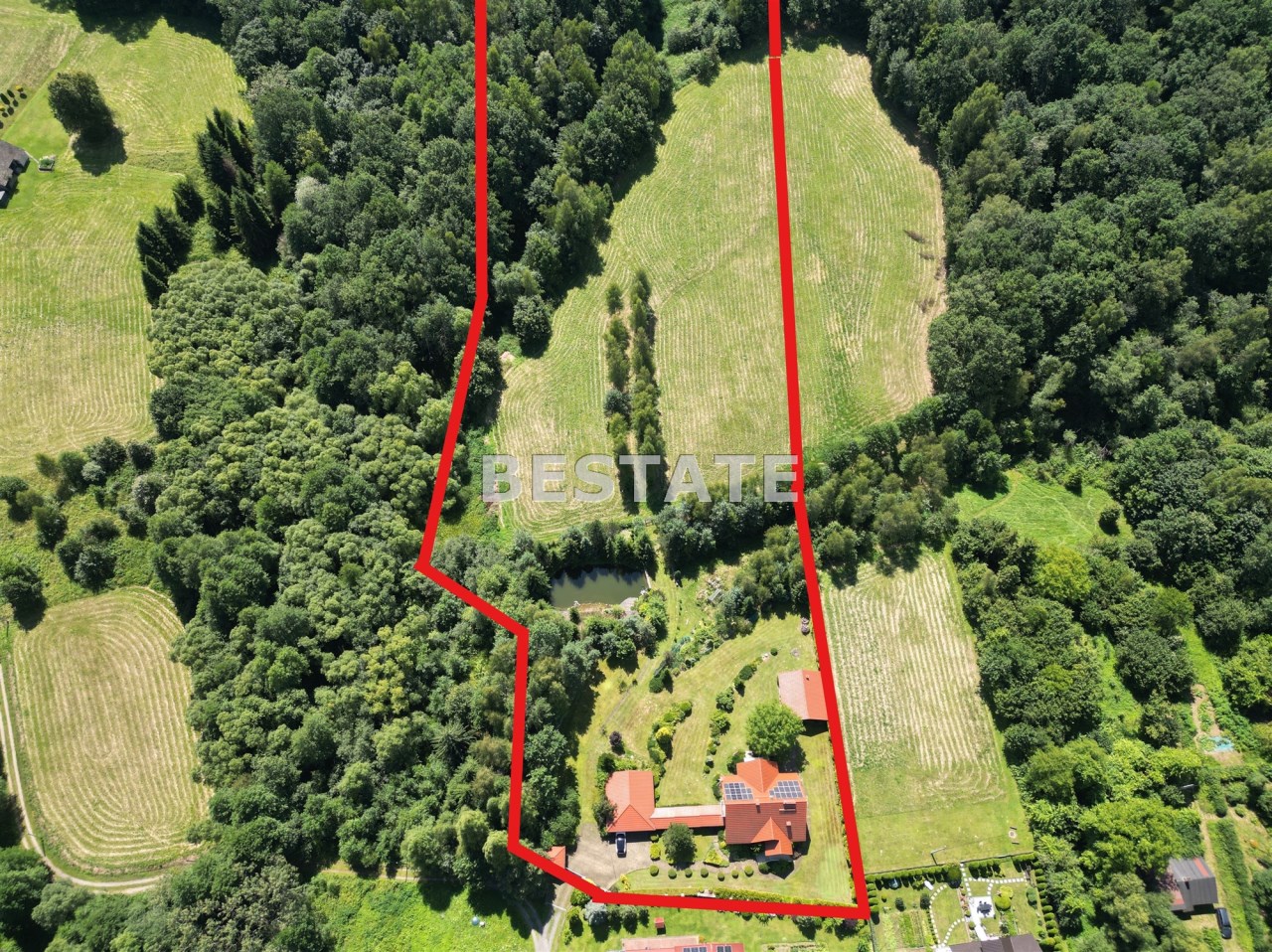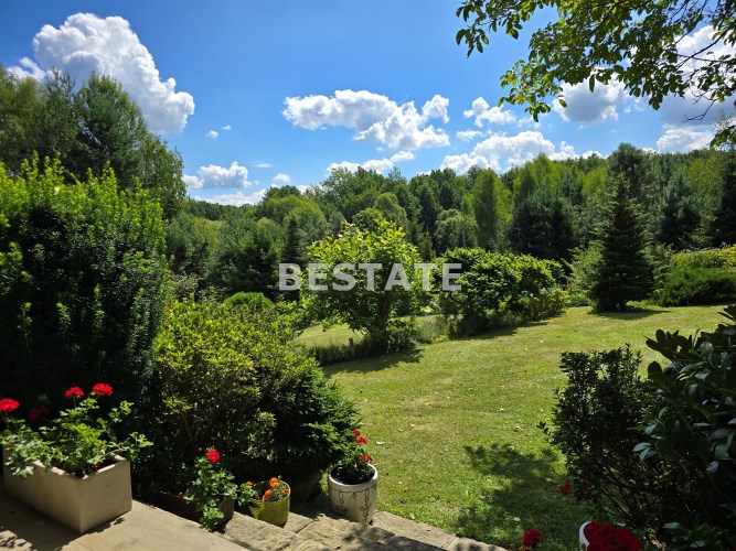 Urok nieruchomości podkreśla prywatny staw (ponad 150 m²) oraz starannie utrzymana zieleń. Z trzech stron pełna intymność, brak sąsiadów i piękny widok na otaczające tereny rolno-leśne. Przyjazne sąsiedztwo jest tylko od strony północnej.