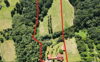 Duża działka, której część ogrodzona to około 5000 m2, pozostałą cześć stanowi prywatny lat oraz łąki.