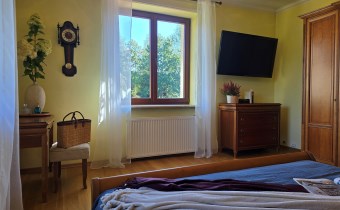 Na parterze znajduje się również duży pokój (sypialnia), przestronny przedpokój ze stylowymi, drewnianymi schodami prowadzącymi na poddasze, oraz łazienka i oddzielna toaleta. Główne wejście do domu z wiatrołapem mieszczącym dużą szafę.