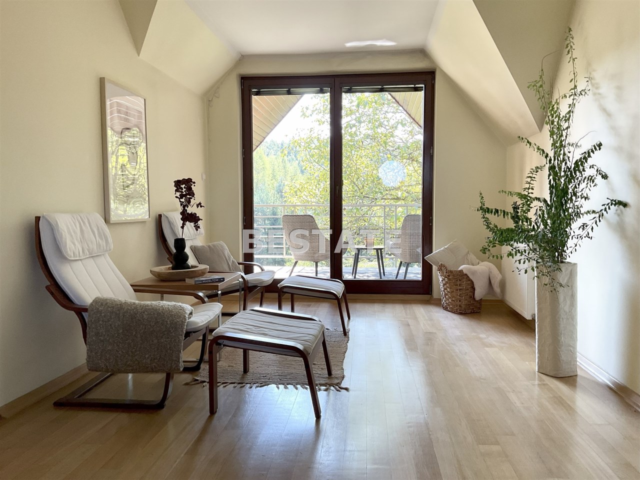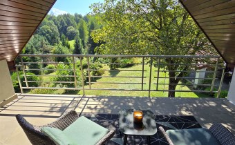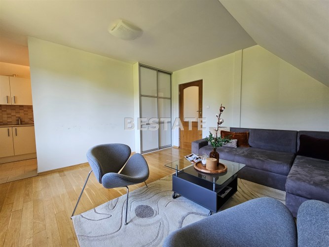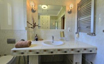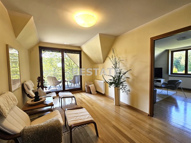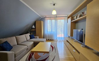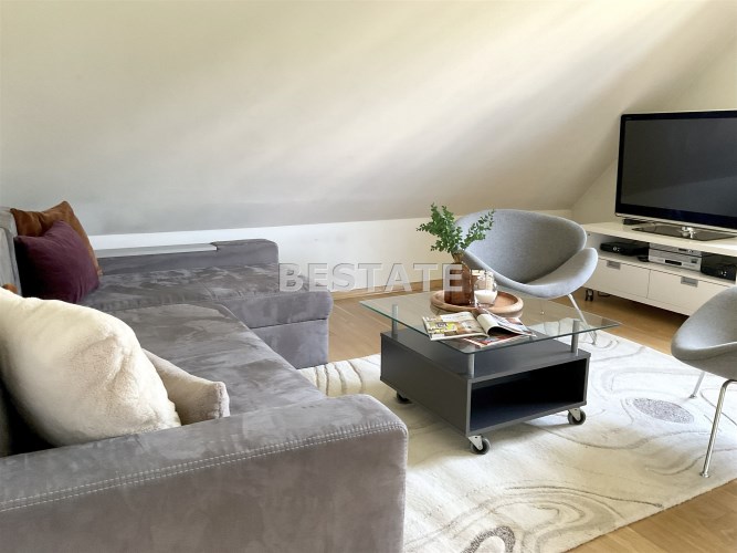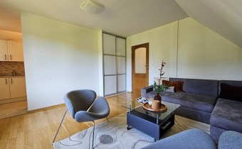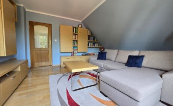 Na poddaszu znajdują się trzy przestronne sypialnie, jedna w wydzieloną kuchnią, łazienka z toaletą, oraz otwarta przestrzeń, którą można zagospodarować w dogodny dla siebie sposób, stół bilardowy lub ping pong, albo piękna biblioteczka. Komfort dodają dwa balkony z pięknym widokiem.