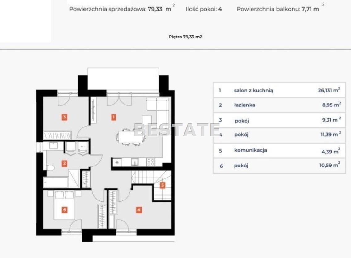 Prezentowany lokal znajduje się na pierwszym piętrze o pow. 79,33m.kw. z balkonem o pow. 7,71m.kw., składa się z salonu z aneksem kuchennym o pow.26,13m.kw, 3 sypialni o pow. odpowiednio 10,59m.kw, 11,39m.kw, 9,31m.kw, łazienki o pow. 8,95m.kw i komunikacji o pow. 4,39m.kw.