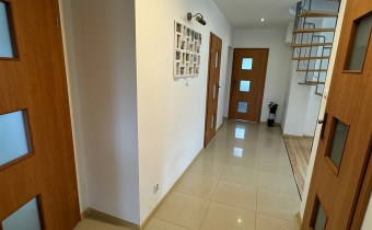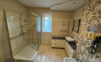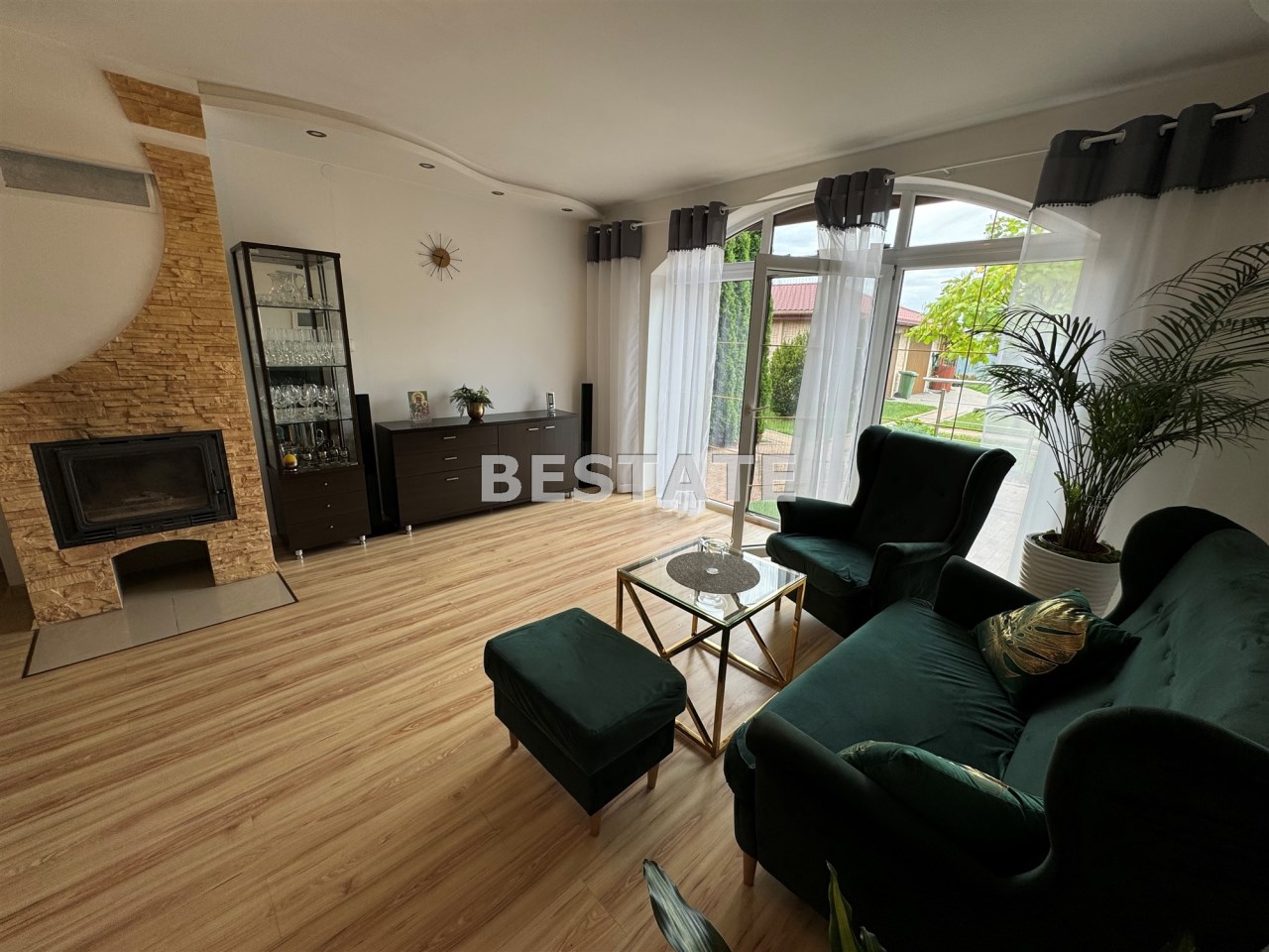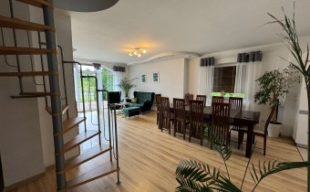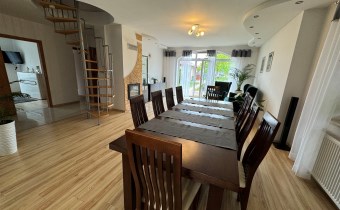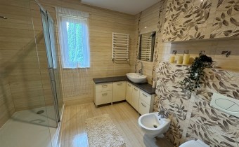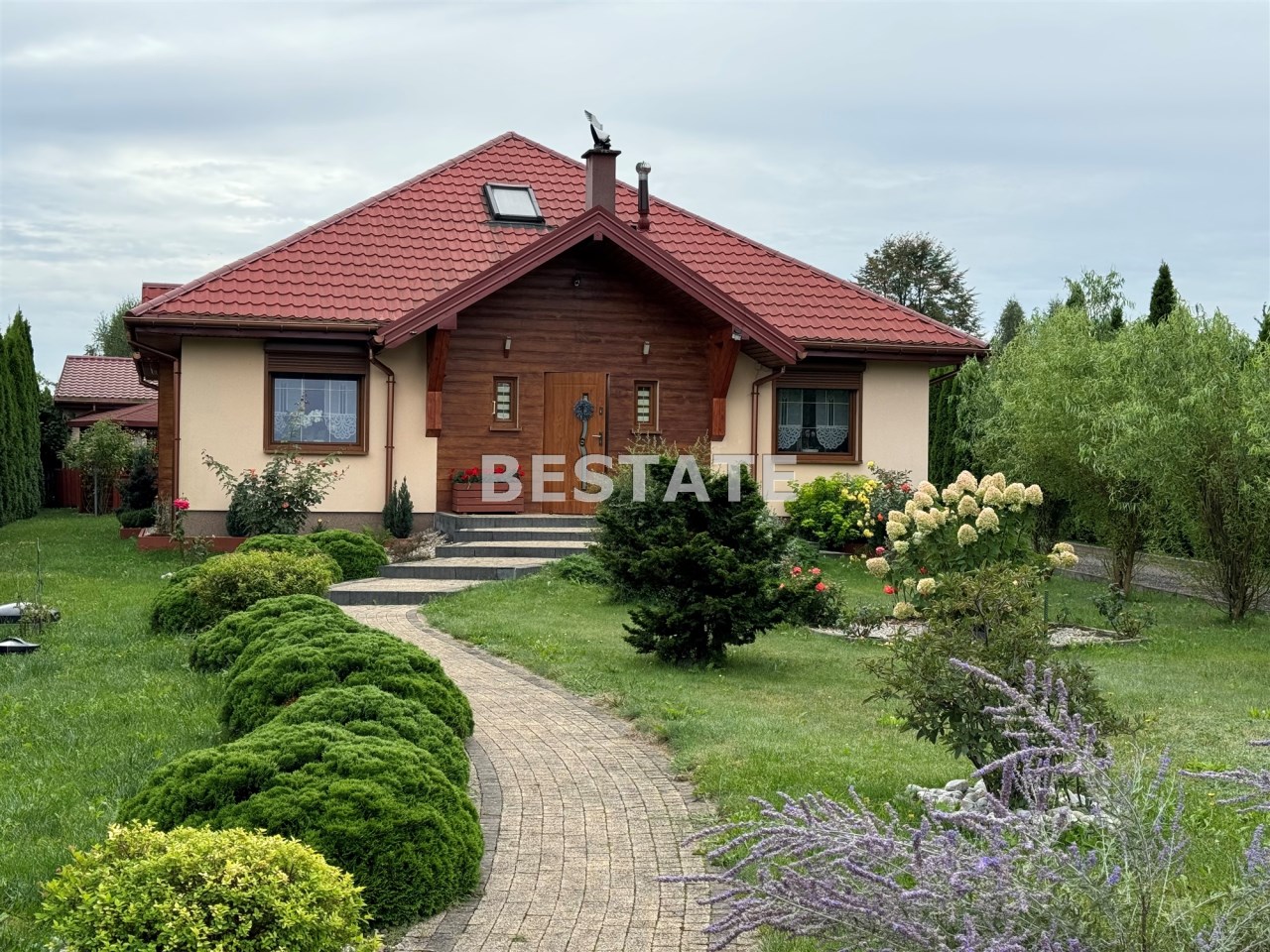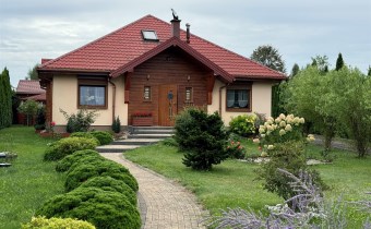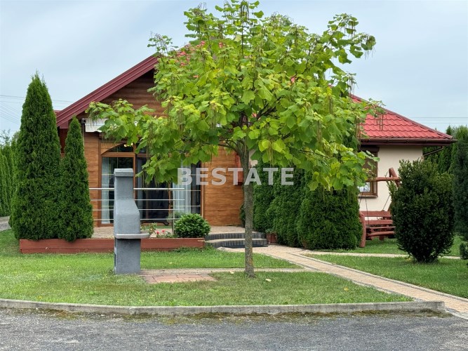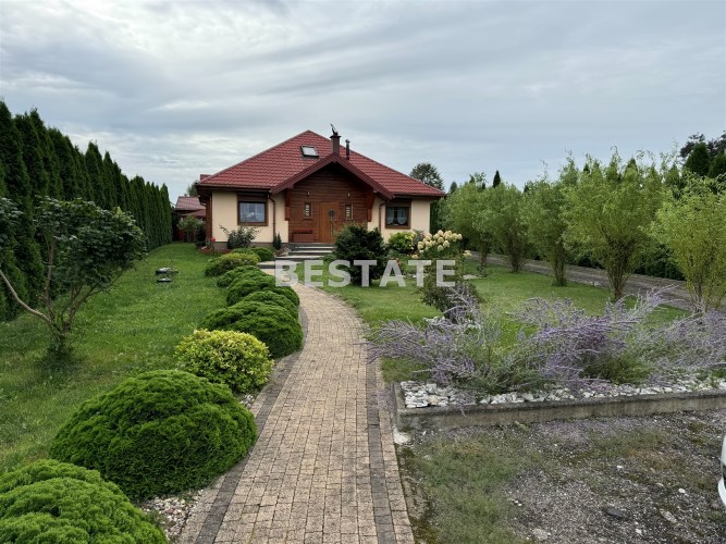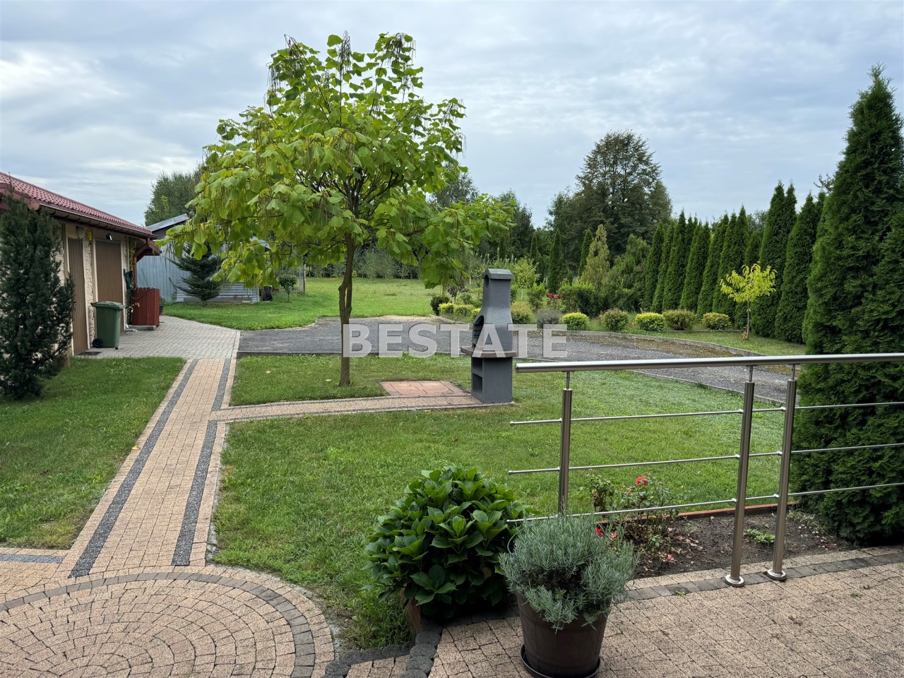 Na podłogach w pokojach, jadalni, garderobie i przedpokoju znajduje się parkiet, a na ścianach gładź pomalowana. W pozostałych pomieszczeniach glazura i terakota. Dom umeblowany i wyposażony. Teren wokół domu zadbany, ogrodzony, brama wjazdowa, przydomowa oczyszczalnia, ogrzewanie - piec na węgiel i drewno, kominek. Na posesji znajduje się duży budynek gospodarczy o pow. 54,25 m².