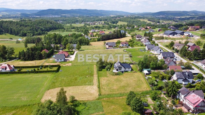 Działka budowlana 904 m² – Zawada, gm. Myślenice – media na działce, teren płaski.
