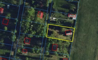 Działka z domkiem letniskowym i budynkiem gospodarczym w otoczeniu lasów.