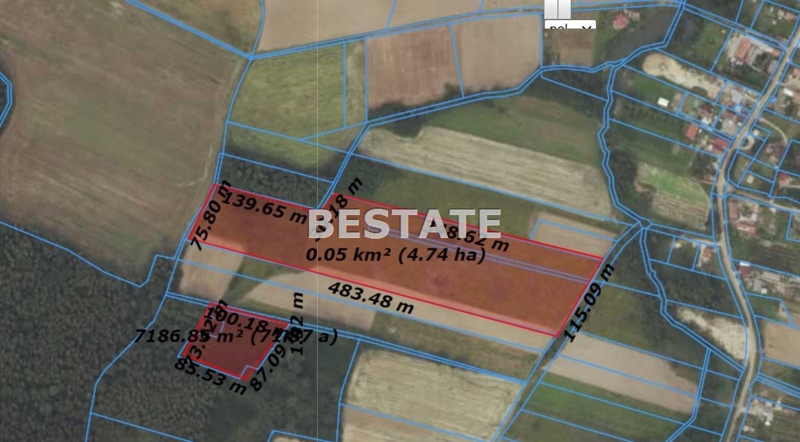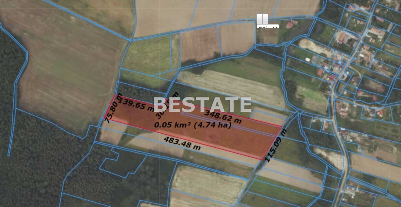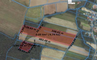 prostokątna otoczona polami i granicząca z lasem. Składa się z dwóch działek o pow. 47500 i 6800 m.kw. Rodzaj użytków to RIIIA, RIIIB, RIVA, RIVB, RV, ŁIII. Przeznaczenie nieruchomości w Miejscowym Planie Zagospodarowania Przestrzennego - rola. Do najbliższych zabudowań ok. 120 metrów. Połączenie z drogą gminną za pośrednictwem sąsiadującej drogi utwardzonej.