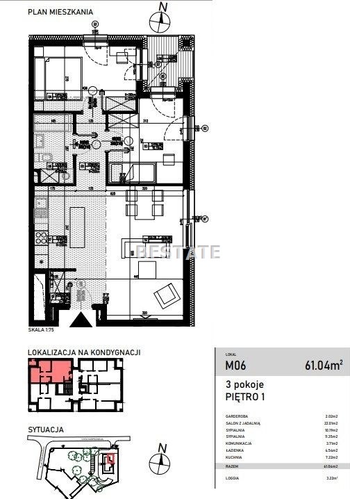 Prezentowane mieszkanie składa się z: salonu z jadalnią o pow. około 22 m.kw, dwóch pokoi o pow. po 10 m.kw każdy, kuchni o pow. 7 m.kw, łazienki o pow. 6 m.kw, przedpokoju o pow. 4 m.kw oraz garderoby o pow. 2 m.kw. Loggia o pow. około 3,5 m.kw.