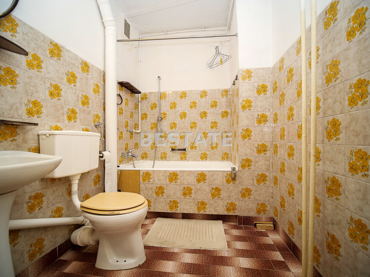 - Łazienka wykończona płytkami z zabudowaną wanną, umywalką i toaletą.