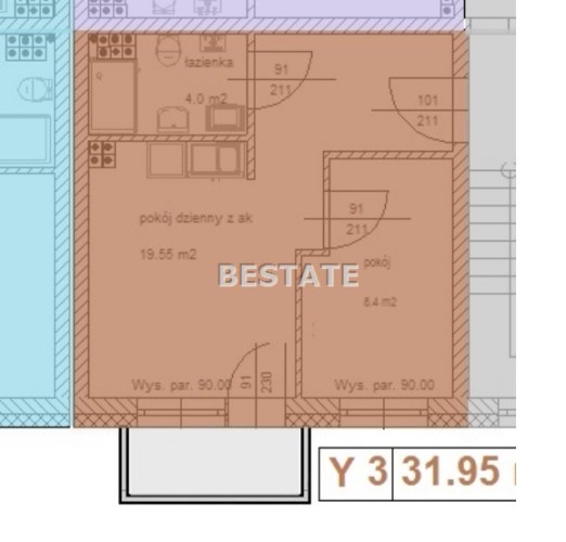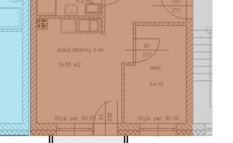 2027 r. Mieszkanie składa się z salonu połączonego z aneksem kuchennym o pow. 19,55 m.kw., sypialni o pow. 8,4 m.kw., łazienki o pow. 4 m.kw. Z salonu jest wyjście na