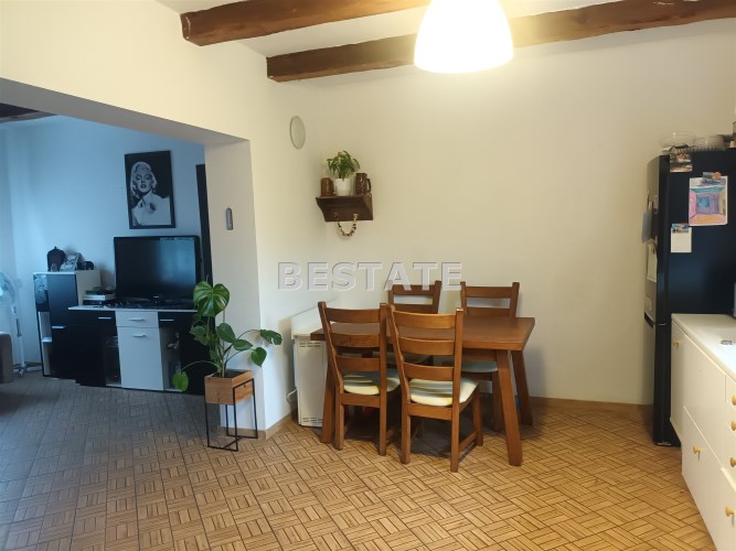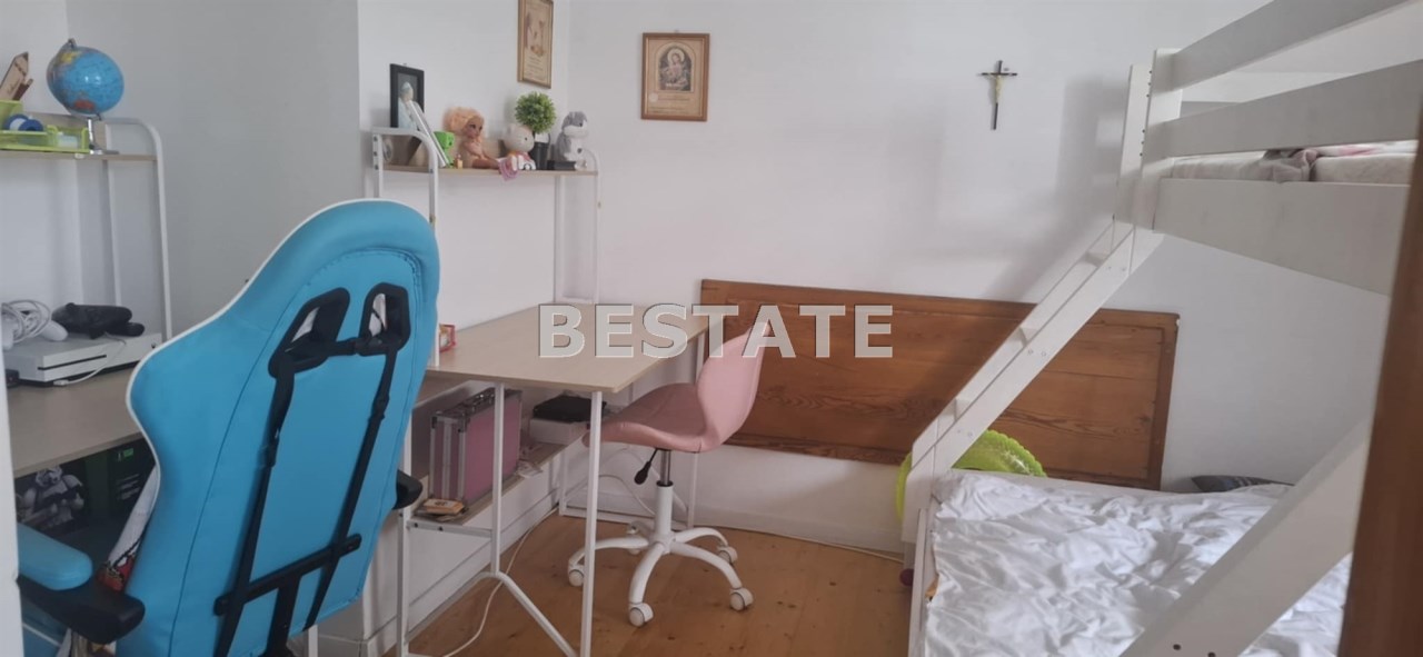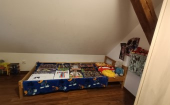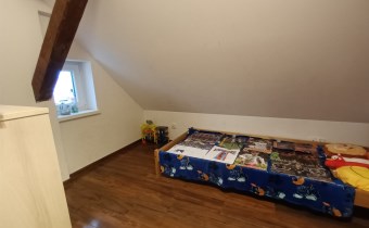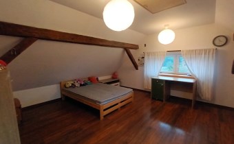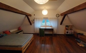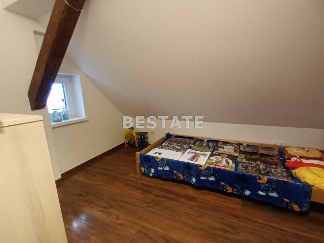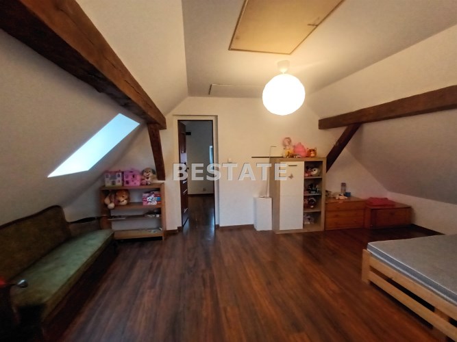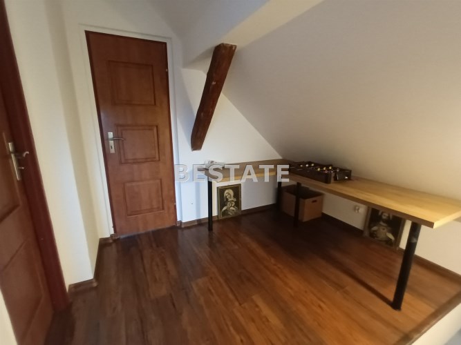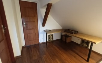 Sprzedam dwupoziomowe mieszkanie o pow. ok 80 m.kw. z dużą działką o pow. 1100 m.kw., które stanowi połowę domu. Usytuowane jest ono na na piętrze i poddaszu, posiada oddzielne wejście, dwa tarasy. Pierwszy poziom o pow. 49 m.kw składa się z dużego salonu z aneksem kuchennym i jadalnią, jednej sypialni, łazienki i korytarza. Na drugim poziomie o tej samej powierzchni po podłodze (ok. 30 m.kw pow. użytkowej) znajdują się dwie sypialnie i korytarz. Mieszkanie na księdze wieczystej ma powierzchnię 51,5 m.kw.