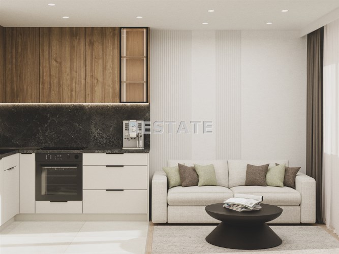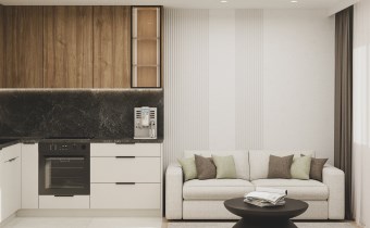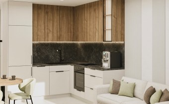 przestronny salon z aneksem kuchennym z wyjściem na balkon typu loggia