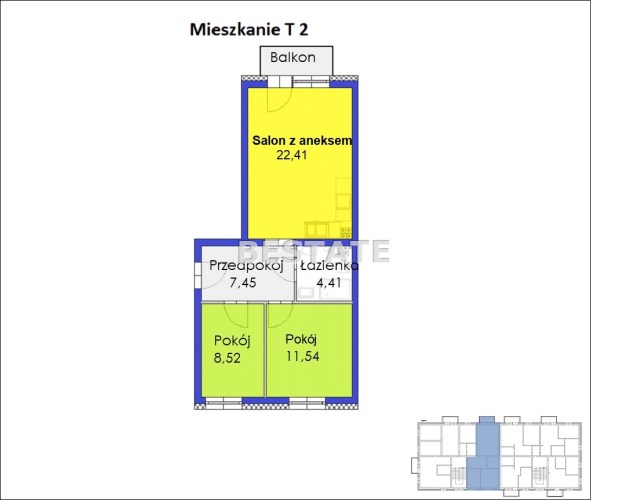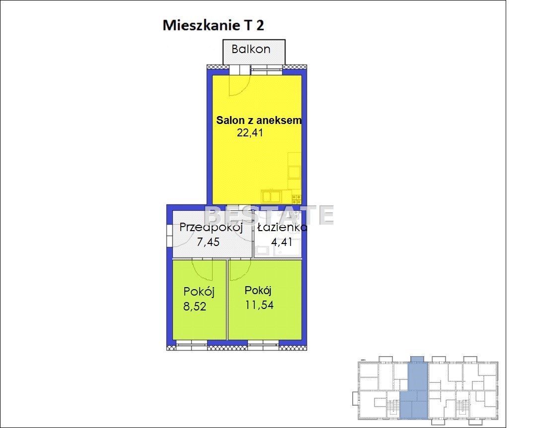 2027 r. Mieszkanie składa się z salonu połączonego z aneksem kuchennym o pow. 22,41 m.kw., dwóch sypialni o pow. 11,54 m.kw i 8,52 m.kw., łazienki o pow. 4,41 m.kw. oraz przedpokoju o pow. 7,45 m.kw. Z salonu jest wyjście na