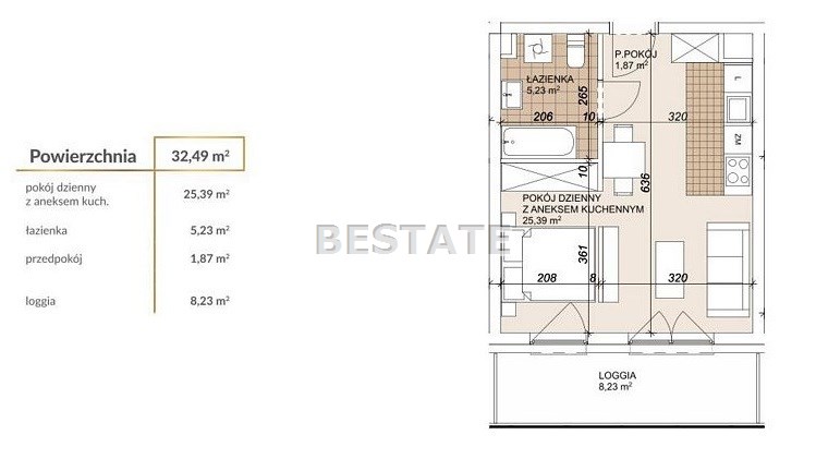 Prezentowane mieszkanie o powierzchni użytkowej 32,49 m.kw,  składa się z salonu z aneksem kuchennym o powierzchni 25,39 m.kw, łazienki o pow. 5,23 m.kw, przedpokoju o pow. 1,87 m.kw. oraz balkonu o pow. 8,23 m.kw