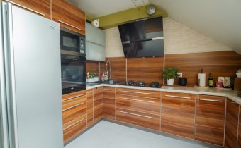 - W kuchni nowoczesne meble wykonane na wymiar, ze sprzętami AGD: płytą gazową, piekarnikiem, lodówko-zamrażarką, zmywarką i okapem