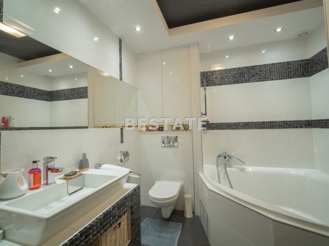 - W łazience wanna, toaleta w zabudowie podtynkowej, nowoczesne płytki, meble i oświetlenie