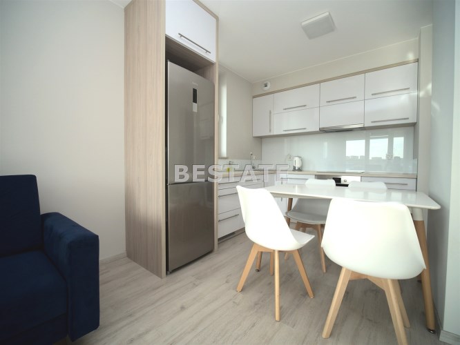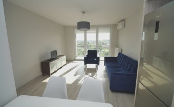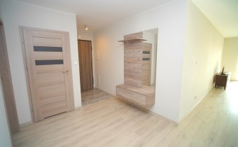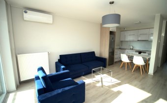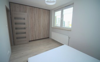 W sypialni szafa w zabudowie oraz duże łóżko. Drugi pokój do umeblowania. W salonie sofa oraz fotel w modnym kobaltowym kolorze, telewizor i co jest sporym atutem duże przeszklone wyjście na balkon. W łazience kabina prysznicowa szafka z umywalką i lustrem oraz podwieszana toaleta.