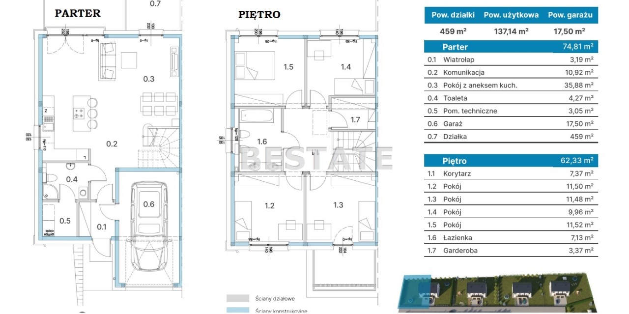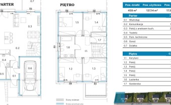 strefa sypialniana- piętro: cztery pokoje o pow. 11,50m.kw, 11,44m.kw, 11,52m.kw i 9,96m.kw, łazienka o pow. 7,13m.kw, garderoba o pow. 3,37m.kw. Dodatkowa powierzchnia to korytarze oraz garaż o pow. 17,50m.kw.