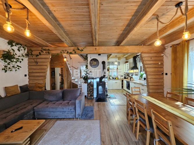 Na sprzedaż klimatyczny drewniany dom o powierzchni ok. 100 m², położony w spokojnej i zielonej miejscowości Trzebunia. Nieruchomość znajduje się na działce o powierzchni 25 arów, z fragmentem własnego lasku oraz dostępem do strumyka.