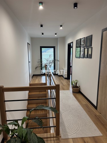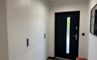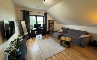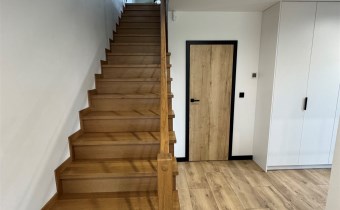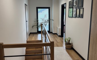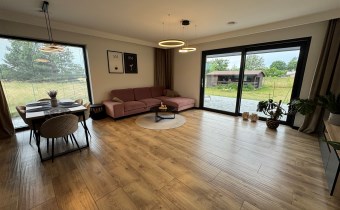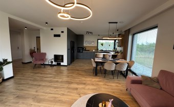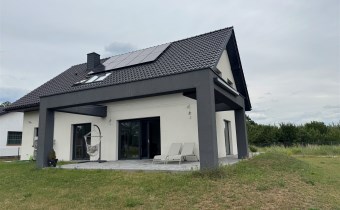 Parter domu o powierzchni użytkowej  80,23 m.kw, w tym: przestronny, widny  salon z kominkiem  i aneksem kuchennym o pow. około 40 m.kw.,pokój o pow. około 8 m.kw. łazienka z wc o pow. 4 m.kw. kotłownia o pow 7 m.kw, garaż o pow. 19,38 m.kw. W kuchni meble na wymiar wraz ze sprzętem  AGD (płyta indukcyjna, zmywarka, piekarnik elektryczny, okap, lodówko-zamrażarka oraz bardzo funkcjonalna  spiżarnia o pow.1,5 m.kw. Taras od zachodu z funkcją otwierania i zamykania  zadaszenia.