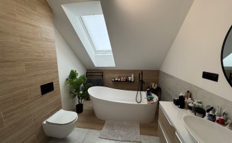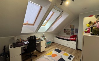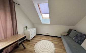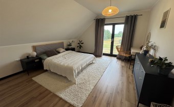 Piętro o powierzchni  86,72 m.kw. gdzie znajdują się duża sypialnia z garderobą (20,40m.kw) + 3 pokoje ( 17,21m.kw, 11,36m.kw i 8,43m.kw) oraz pralnia o pow. 5,93 m.kw, która może pełnić rolę dodatkowego pokoju, łazienka o pow. 5,67 m.kw.