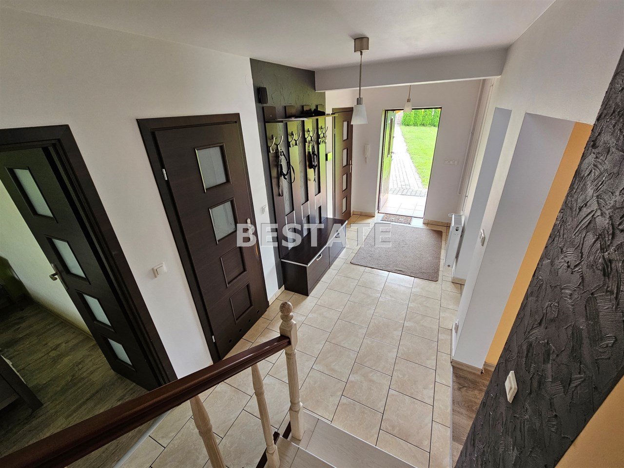 Dom jest gotowy do zamieszkania – wykończony w ciepłym, nowoczesnym stylu. Na podłogach znajdują się panele oraz terakota. W części pomieszczeń zastosowano ogrzewanie podłogowe dla jeszcze większego komfortu.