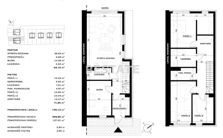 Inwestycja składa się z sześciu budynków w zabudowie bliźniaczej, łącznie z dwunastu domów, o powierzchniach od 93,13- 137,60 m.kw. Cena za metr kwadratowy od 10 501 zł do 10 871 zł Każdy budynek ma do dyspozycji dwa miejsca postojowe przed budynkiem lub garaż i jedno miejsce postojowe. Prezentowana oferta domu to 135,13 m.kw, składa się z salonu z kuchnią w aneksie, trzech sypialni, dwóch łazienek i garderoby. Powierzchnia działki 330 m.kw ( ogrodu 107m.kw) Planowany odbiór 30.09.2025r .Kontakt: