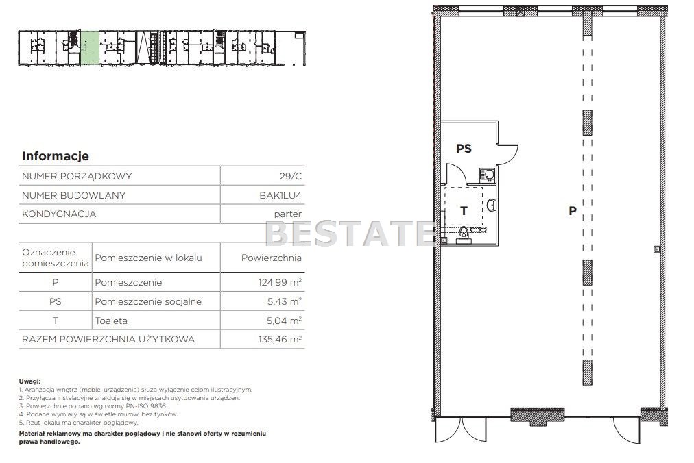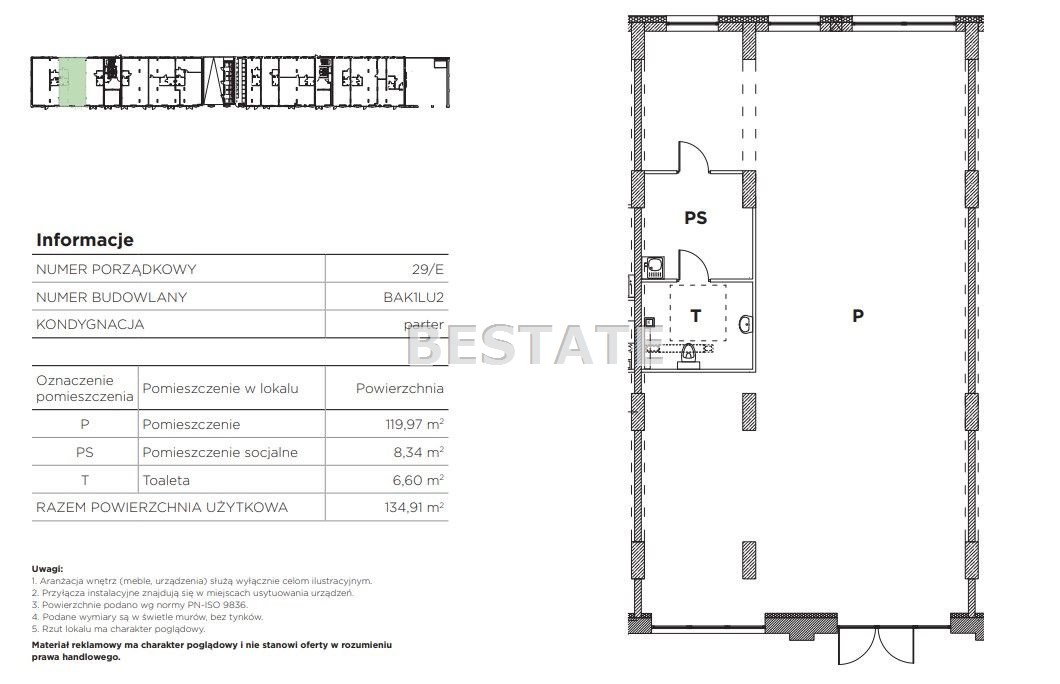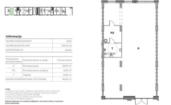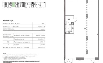 Prezentowany lokal o powierzchni użytkowej 134,91 m.kw. składa się z pomieszczenia głównego o pow. 119,97 m.kw., pokoju socjalnego o pow. 8,34 m.kw. oraz toalety o pow. 6,60 m.kw. Usytuowany jest na parterze oddanego do użytku budynku. Przeszklone witryny zapewniają możliwość umieszczenia reklamy. Garaż podziemne.