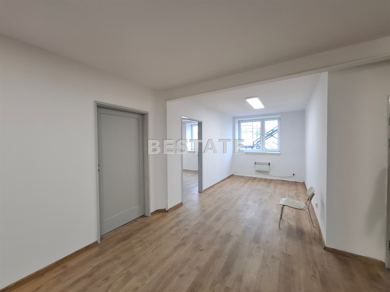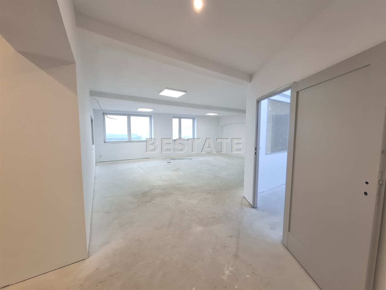 BESTATE Nieruchomości Pabianice oferuje do wynajęcia pomieszczenia biurowe o pow. 95,30 + zaplecze sanitarne. Podłoga wykończona posadzką cementową lub panelami podłogowymi. W dachu znajdują się świetliki doświetlające pomieszczenia. Istnieje możliwość wynajmu większej powierzchni  biurowej ponieważ można łączyć pomieszczenia