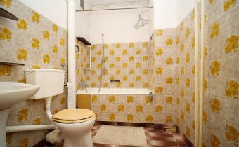 • Łazienka wykończona płytkami z zabudowaną wanną, umywalką i toaletą.