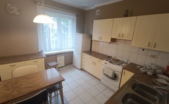 Mieszkanie do odświeżenia (jedynie łazienka wymaga remontu). W kuchni znajdują się meble, kuchenka gazowa, lodówko-zamrażarka. W łazience wanna, szafki, pralka i wc. W pokoju dziennym komplet wypoczynkowy, stół z krzesłami, w sypialni duża szafa i kanapa. W pokojach na podłodze położony jest parkiet, w przedpokoju, kuchni i łazience z wc płytki. Na ścianach gładzie, płytki oraz tapeta. Mieszkanie dwustronne rozkładowe, okna pcv z ekspozycją na płn.-wsch. i płd.-zach., duży balkon. Do mieszkania przynależy komórka lokatorska o pow. ok.3 m.kw. Blok z cegły, docieplony, wejście zabezpieczone domofonem. Centralne ogrzewanie i ciepła woda miejskie. W okolicy szkoła, przedszkole, sklepy, markety, rynek. Komunikacja miejska - autobus, tramwaj.