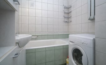 Łazienka wykończona została płytkami ceramicznymi, wyposażona w wannę – idealną zarówno do szybkiego prysznica, jak i relaksującej kąpieli. W przedpokoju znajduje się duża, pojemna szafa garderobiana, zapewniająca praktyczne miejsce do przechowywania.