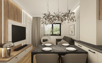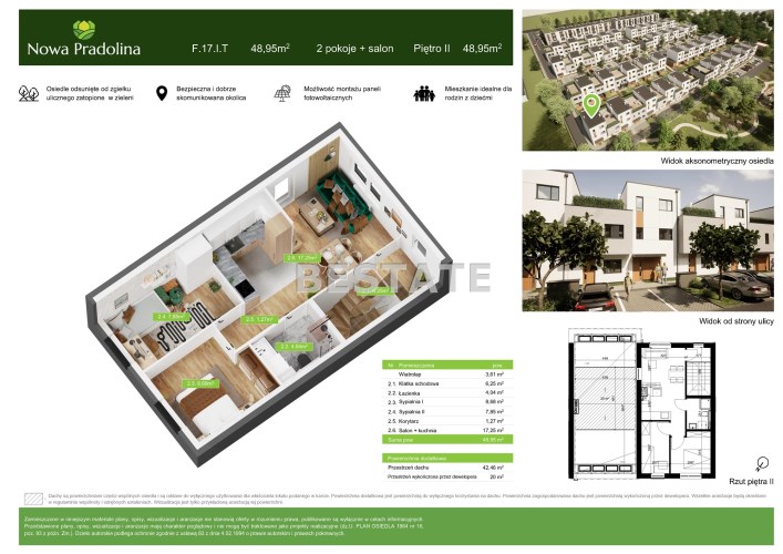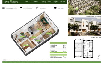 Przykładowe mieszkanie F.17.I.  ma powierzchnię 48,95 m2 i znajduje się na drugim piętrze. Lokal składa się z salonu i aneksu kuchennego, dwóch pokoi  oraz łazienki. Wystawa okienna w stronę południową z dużym tarasem o powierzchni 42,46m2.
