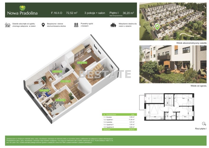 Przykładowe dwupoziomowe mieszkanie F.16.II.O  ma powierzchnię 72,52 m2 i znajduje się na parterze. Lokal składa się z salonu i aneksu kuchennego, trzech pokoi  oraz dwóch łazienek. Wystawa okienna w stronę północną i południową z ogródkiem o powierzchni 36,8m2.