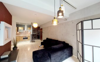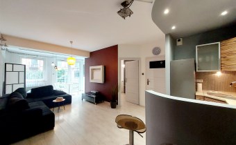 Nieruchomość składa się z salonu połączonego z kuchnią o powierzchni 26,6 m.kw, sypialni o pow. 13,7 m.kw oraz łazienki z prysznicem i wc o pow. 8,8 m.kw. Kuchnia z meblami i sprzętem agd (lodówko-zamrażarka, płyta elektryczna, piekarnik, okap, zmywarka, zlew).