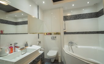 - W łazience wanna, toaleta w zabudowie podtynkowej, nowoczesne płytki, meble i oświetlenie