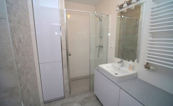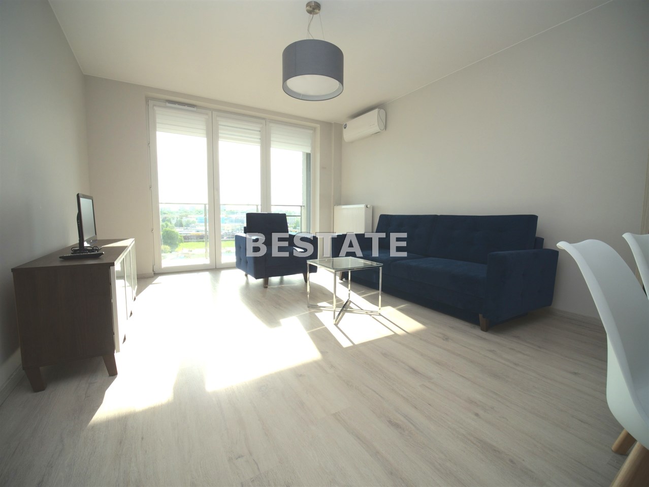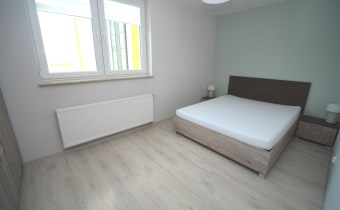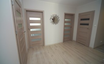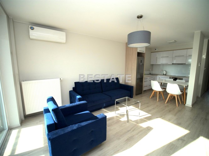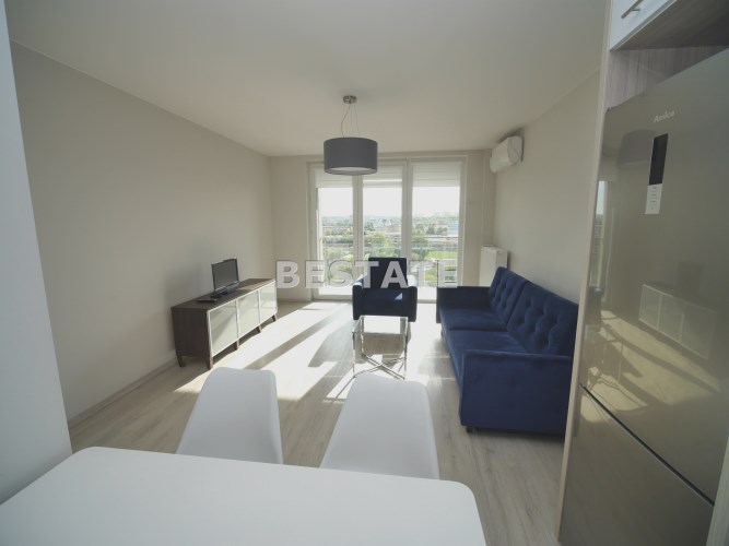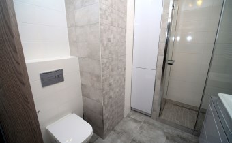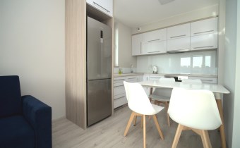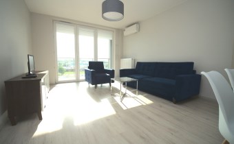 W sypialni szafa w zabudowie oraz duże łóżko. Drugi pokój do umeblowania. W salonie sofa oraz fotel w modnym kobaltowym kolorze, telewizor i co jest sporym atutem duże przeszklone wyjście na balkon. W łazience kabina prysznicowa szafka z umywalką i lustrem oraz podwieszana toaleta.